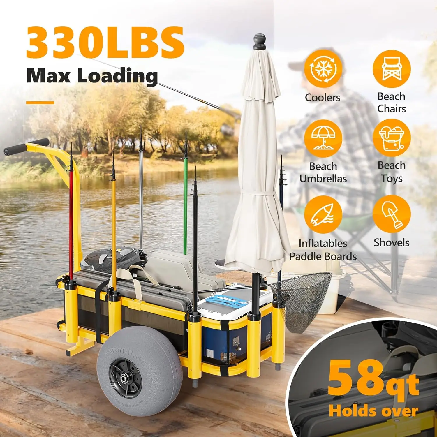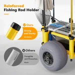 Transport your gear easily with the Foldable Sand Wagon Trolley. Featuring 13″ big balloon wheels, 8 fishing rod holders, and a mesh storage bag, this trolley can carry up to 300 lbs. Perfect for fishing trips, beach outings, or outdoor adventures, it’s portable, durable, and includes a hand pump for quick tire inflation.