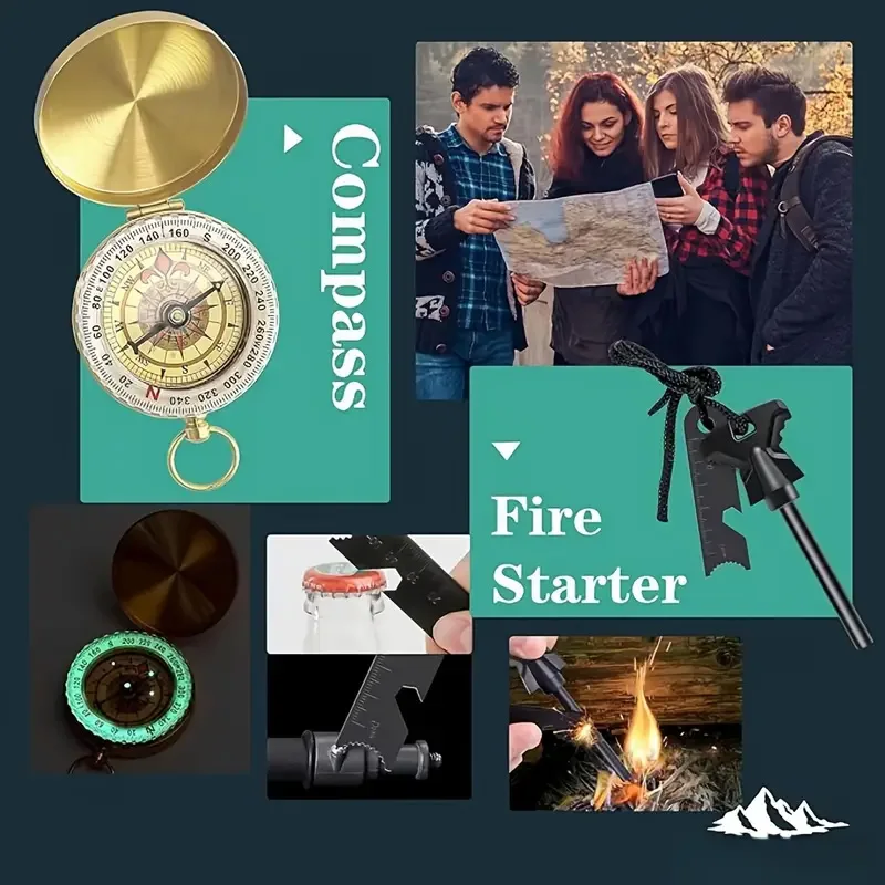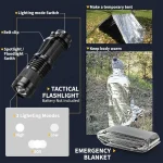 - Included Gear: Tactical folding knife, fire starter, flashlight, wire saw, emergency blanket, whistle, compass, multi-tool card, paracord bracelet, first-aid supplies, and additional survival accessories
